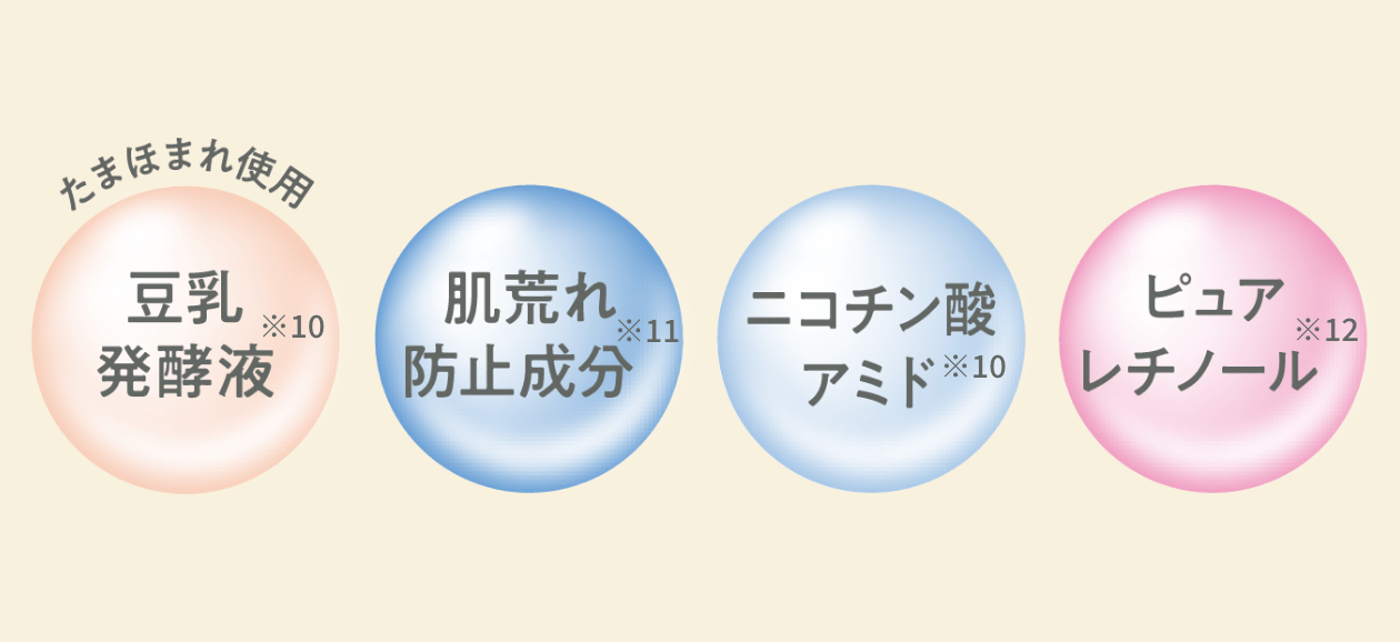 大人の毛穴悩みにアプローチ※3エイジングケアラインにふさわしい大豆「たまほまれ」を使用した豆乳発酵液※10に加えて、肌荒れ防止有効成分※11と大人の肌に嬉しいニコチン酸アミド※10とピュアレチノール※12を配合。毛穴の汚れを洗い流し、ハリと透明感のあるお肌へ!